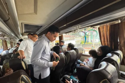Wakil Presiden (Wapres) Gibran Rakabuming menyapa para peserta Program Mudik Bersama Holding BUMN Danareksa 2026 yang akan berangkat menuju berbagai…